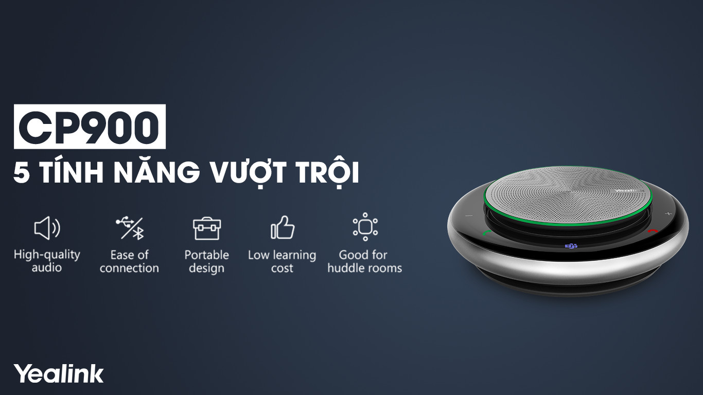 Chất lượng pin cao cấp cho thời gian đàm thoại lên đến 12 giờ. Loa không dây bluetooth này được tích hợp công nghệ khử tiếng ồn thụ động, cho hiệu suất âm thanh HD. Dưới đây sẽ là 5 đặc tính nổi bật của loa hội nghị Yealink CP900