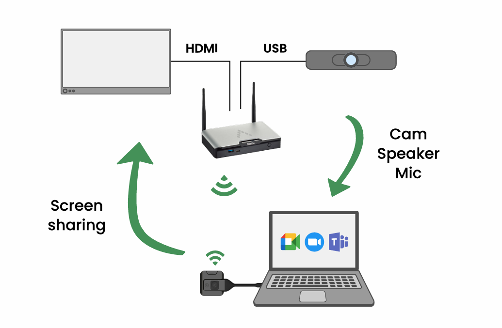 Người dùng thoải mái sử dụng laptop cá nhân vốn quen thuộc, dễ thao tác. Phòng họp chỉ đóng vai trò mở rộng (với camera, micro, màn hình lớn) giúp nâng cao trải nghiệm, thay vì bắt buộc phải sử dụng thiết bị của bên thứ ba.