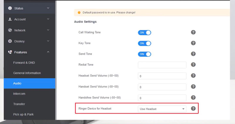 Bước 4: Bật chế độ Ringer Device for Headset là Use Headset qua giao diện người dùng Web của điện thoại.