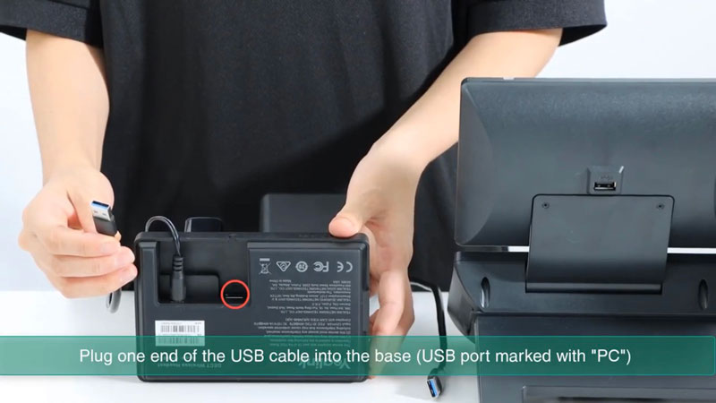 Bước 1: Cắm 1 đầu cáp USB vào cổng USB ở phía dưới đế ( cổng USB được đánh dấu với kí hiệu “PC”)