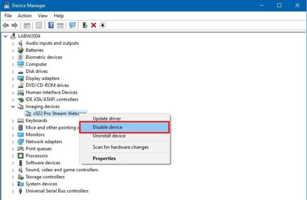 - Nhấp chuột phải vào webcam và chọn tùy chọn Disable device