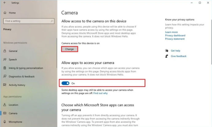- Bật nút chuyển đổi Camera access for this device