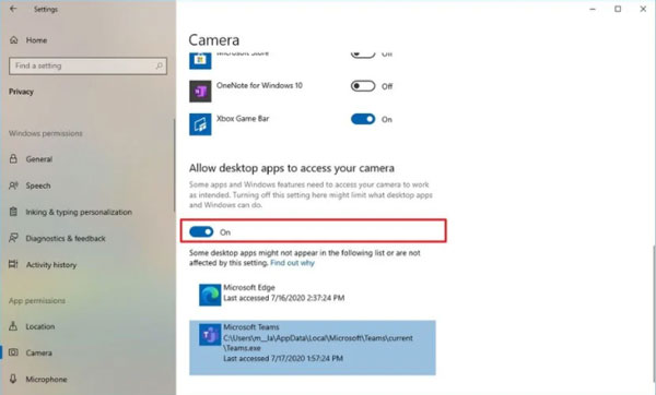 - Bật nút chuyển đổi Allow desktop apps to access the camera