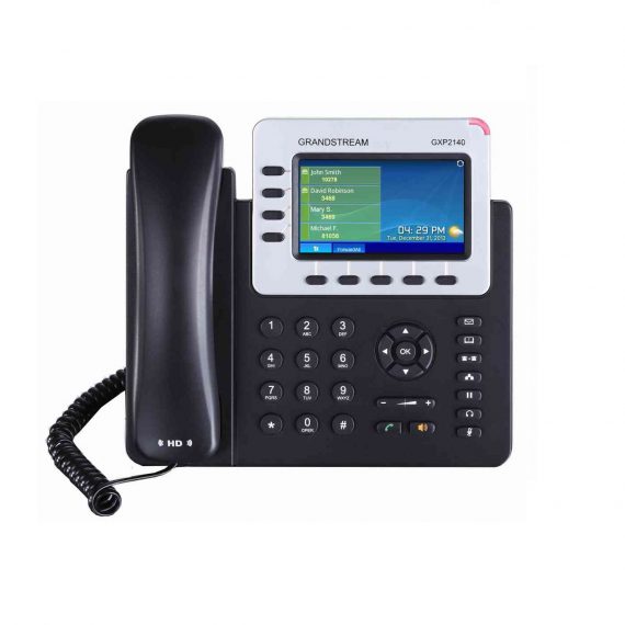 Điện thoại VOIP Grandstream GXP2140 là dòng điện thoại doanh nghiệp với 4 tài khoản SIP và màn hình màu hiển thị lớn 4.3inch. 5 phím lập trình XML. Ngoài ra Grandstream GXP2140 còn làm việc tốt với 4 bàn key kết nối tối đa 160 phím mềm để chuyển cuộc nhanh.