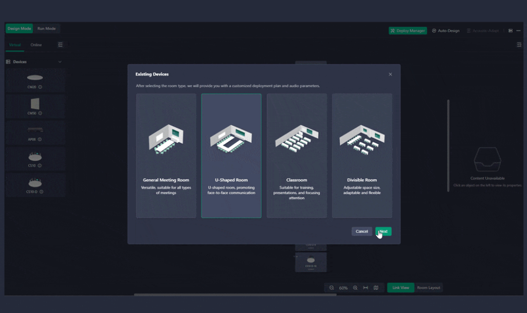- Tự động tạo thiết kế triển khai phòng họp dựa trên thông tin phòng.