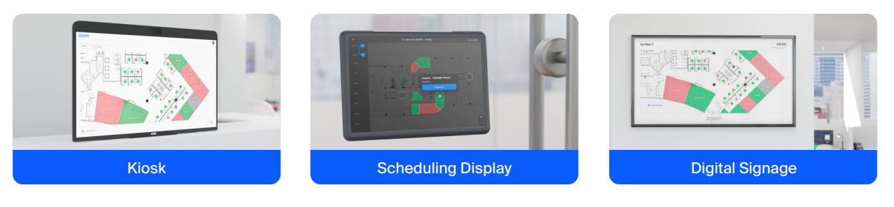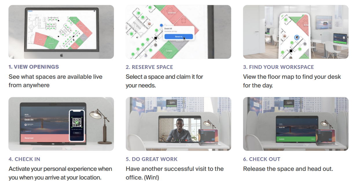 Tính năng này cho phép người dùng linh hoạt đặt trước không gian làm việc, hỗ trợ làm việc theo hình thức kết hợp, cho phép người dùng đặt chỗ từ xa hoặc tại quầy lễ tân, bảng lên lịch bên ngoài Zoom Room hoặc trực tiếp tại không gian làm việc.