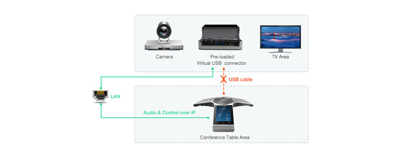 Tích hợp micrô, loa và bảng điều khiển cuộc họp, điện thoại hội nghị Yealink CP960 hỗ trợ một kết nối cáp trong bàn hội nghị, loại bỏ sự cần thiết của cáp USB truyền thống từ khu vực TV đến khu vực bàn hội nghị, đơn giản hóa việc triển khai.