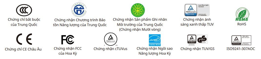 Tất cả các sản phẩm đều tuân theo hệ thống kiểm soát chất lượng nghiêm ngặt và nhiều sản phẩm đã nhận được chứng nhận có thẩm quyền của bên thứ ba, chẳng hạn như CCC, Chứng nhận Bảo tồn Năng lượng Trung Quốc; Chứng nhận Sản phẩm Ghi nhãn Môi trường của Trung Quốc; Chứng nhận Ánh sáng xanh thấp TUV; CE/CB; FCC; cTUVus; EPA; và TUV/GS. (Các hạng mục chứng nhận cụ thể tùy thuộc vào thông số sản phẩm).