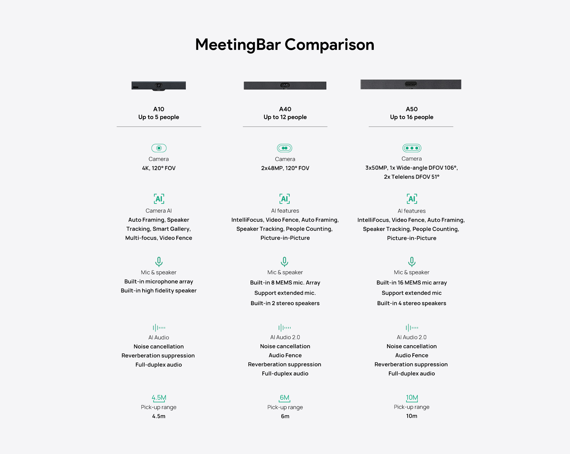 A50 là giải pháp cao cấp nhất trong dòng MeetingBar, dành cho các phòng họp lớn hoặc phòng hội nghị cao cấp. Hệ thống camera mạnh mẽ, khả năng thu âm rộng, âm thanh trong trẻo giúp cuộc họp diễn ra mượt mà như gặp mặt trực tiếp.
