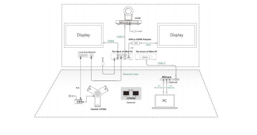 Nội dung sau đây mô tả việc triển khai và kết nối Giải pháp Yealink cho Zoom room, bao gồm máy ảnh CP960, UVC80/ và máy tính mini. CP960 với phiên bản Zoom room, có thể giao tiếp với PC mini được kết nối với cùng một mạng LAN và có thể được sử dụng làm bộ điều khiển Phòng thu phóng, loa và micrô. Plugin Yealink cho ứng dụng Phòng thu phóng và Phòng thu phóng đã được cài đặt trên PC mini. Và camera UVC80 là Plug-and-play. Đảm bảo rằng điện thoại và PC mini của bạn có thể truy cập Internet.