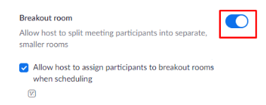 - Bước 3: Tại mục In Meeting, tìm đến Breakout Rooms và bật lên như hình dưới đây. Và nút sẽ bật xanh lên khi tính năng đã được kích hoạt.