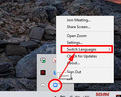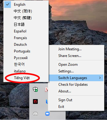 Việc đổi ngôn ngữ trên Zoom không hề phức tạp. Bạn chỉ cần nhấp chuột phải vào biểu tượng Zoom ở khay đông hồ góc dưới bên phải màn hình máy tính. Sau đó chọn Switch Language.