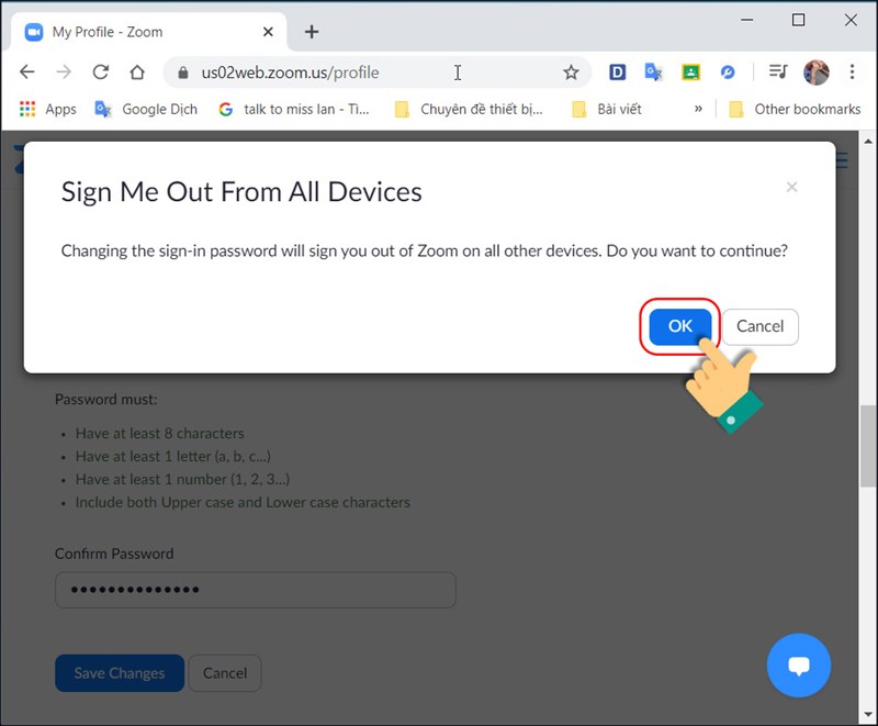 Khi cài đặt thành công mật khẩu bạn sẽ thấy thông báo bạn có muốn thay đổi mật khẩu và đăng xuất tài khoản các thiết bị đang đăng nhập. Nếu không đồng ý thì bạn nhấn OK để tiếp tục.