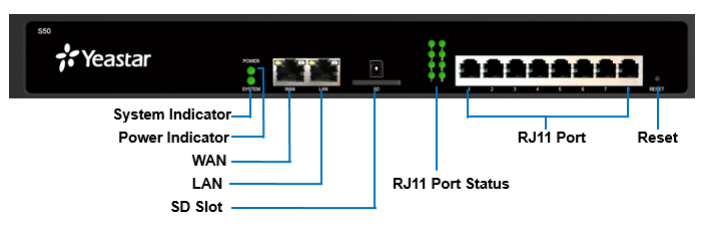| WAN/LAN | Yeastar S50 cung cấp hai cổng Ethernet RJ45 thích ứng 10/100 / 1000Mbps và hỗ trợ 3 chế độ Ethernet. Chế độ mặc định là “Single”.
