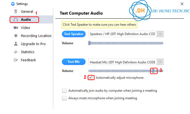 Bạn vào phần “setting”, sau đó chon “audio” tích vào “Automatically adjust Microphone” và kẻo thanh trượt về phía bên trái.
