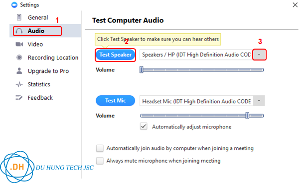 Sau đó, ở mục Audio ở phía trái màn hình, nhấn vào “Test Speaker” nếu bạn nghe thấy âm thanh phát ra ở loa hoặc tai nghe của bạn thì thiết lập âm thanh đã đúng. Nếu vẫn chưa có âm thanh thì bạn có thể chọn các thiết bị khác trong họpo thả xuống và tiếp tục nhấn “Test Speaker” để kiểm tra lại âm thanh.