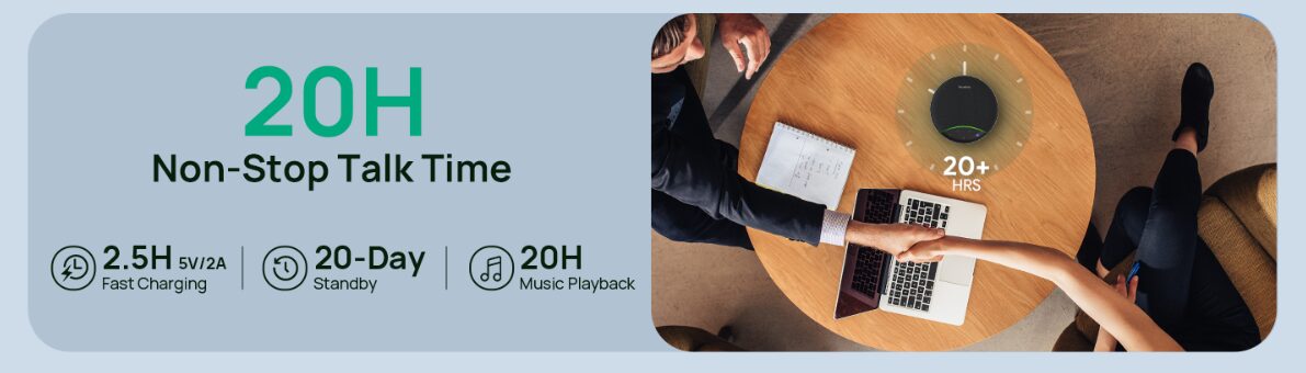 Một trong những ưu điểm vượt trội của Yealink SP92 là thời lượng pin lên đến 20 giờ cho cả thời gian đàm thoại và nghe nhạc. Với thời gian chờ lên đến 20 ngày và chỉ cần 2.5 giờ để sạc đầy, SP92 đảm bảo bạn luôn sẵn sàng cho các cuộc họp kéo dài hoặc các buổi làm việc liên tục mà không lo hết pin. Đây là lựa chọn lý tưởng cho các chuyên gia bận rộn, những người cần một thiết bị đáng tin cậy để duy trì kết nối trong suốt cả ngày.
