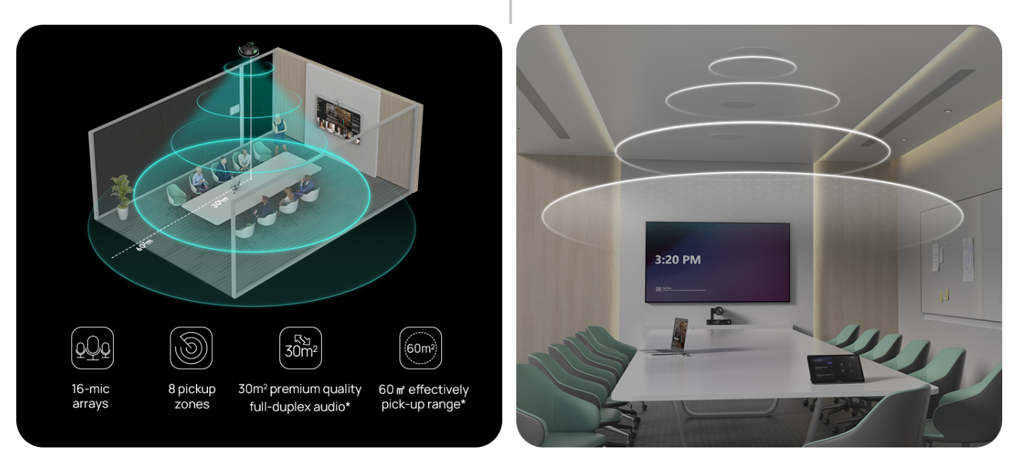 Được tích hợp 8 micro giúp thu giọng nói 360 độ. Công nghệ Beamforming thiết bị có thể định vị giọng nói và tối ưu chất lượng âm thanh tốt nhất. Ngoài ra, Yealink cung cấp công nghệ khử echo và chống ồn giúp âm thanh được truyền đi trở nên trong trẻo hơn. Với một thiết bị Yealink VCM38 có thể bao trọn phạm vi là 40m vuông và một phòng họp có thể lắp tối đa 8 thiết bị đồng thời. Là giải pháp hoàn hảo cho những phòng họp có quy mô lớn.