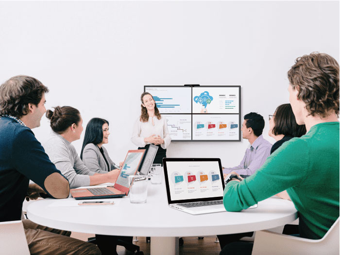 Hỗ trợ truyền tối đa 4 màn hình tới TV, RoomCast hiện thực hóa đa truyền không dây và dễ dàng để chia sẻ nội dung rõ ràng mà không cần chuyển đổi giao diện hoặc bất kỳ thiết bị nào. Trong khi đó, RoomCast hỗ trợ các tính năng cộng tác bao gồm bảng trắng, chú thích và điều khiển từ xa trực quan, dẫn dắt các ý tưởng sáng tạo và mang lại các tương tác trong thời gian thực.
