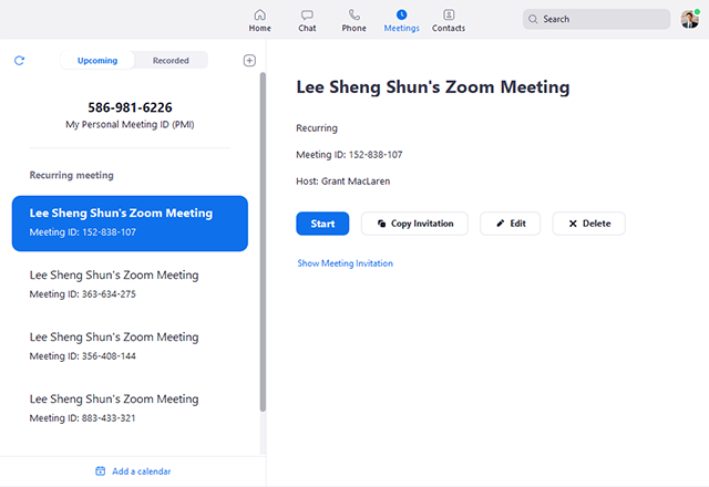 Chọn tab Meetings và bấm Upcoming để xem, bắt đầu, chỉnh sửa và xóa các cuộc họp theo lịch trình.