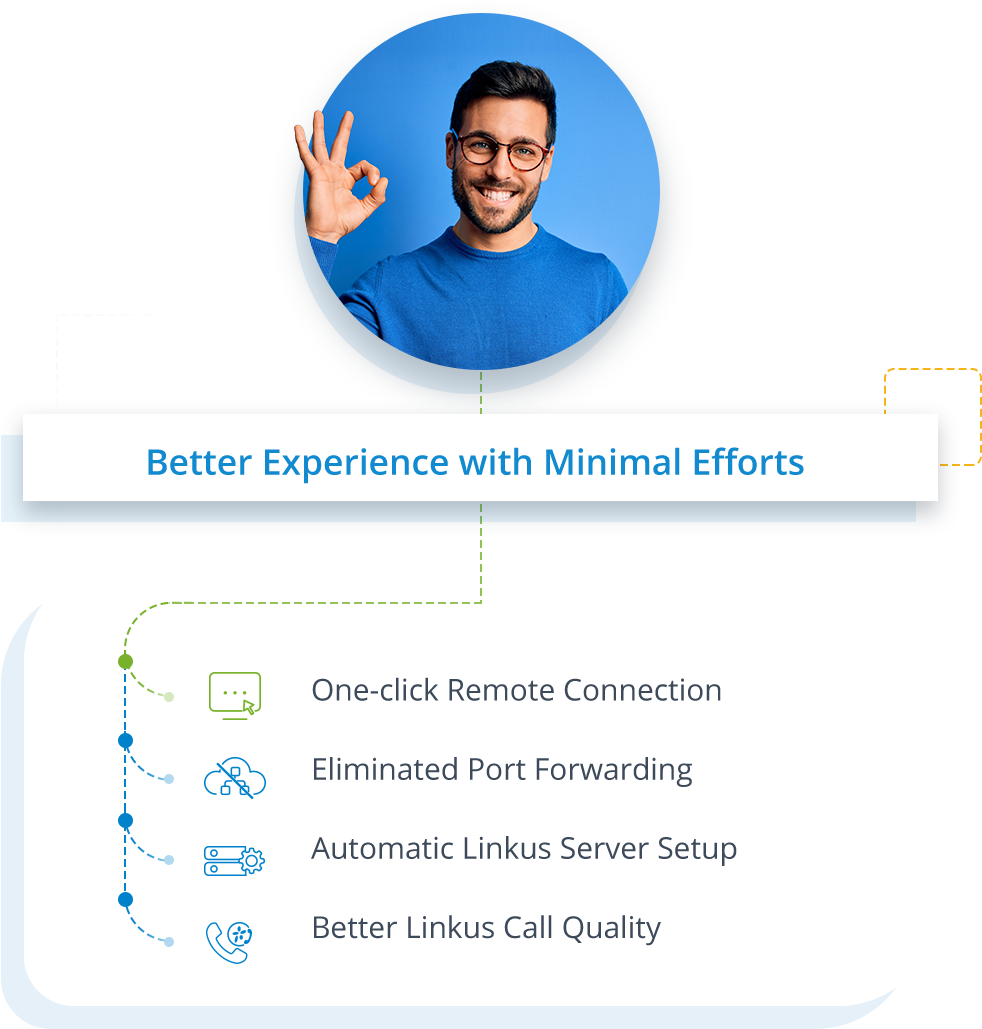 Hệ thống được thiết kế dễ dàng cho việc triển khai, hạn chế các rủi ro phát sinh, giúp thiết lập mạng lưới nhanh chóng, cấu hình máy chủ Linkus dễ dàng. Với sự bổ trợ của Remote Access service, người dùng hoàn toàn không phải lo lắng về các vấn đề xảy ra trong mạng nội bộ gây ảnh hưởng đến trải nghiệm người dùng.