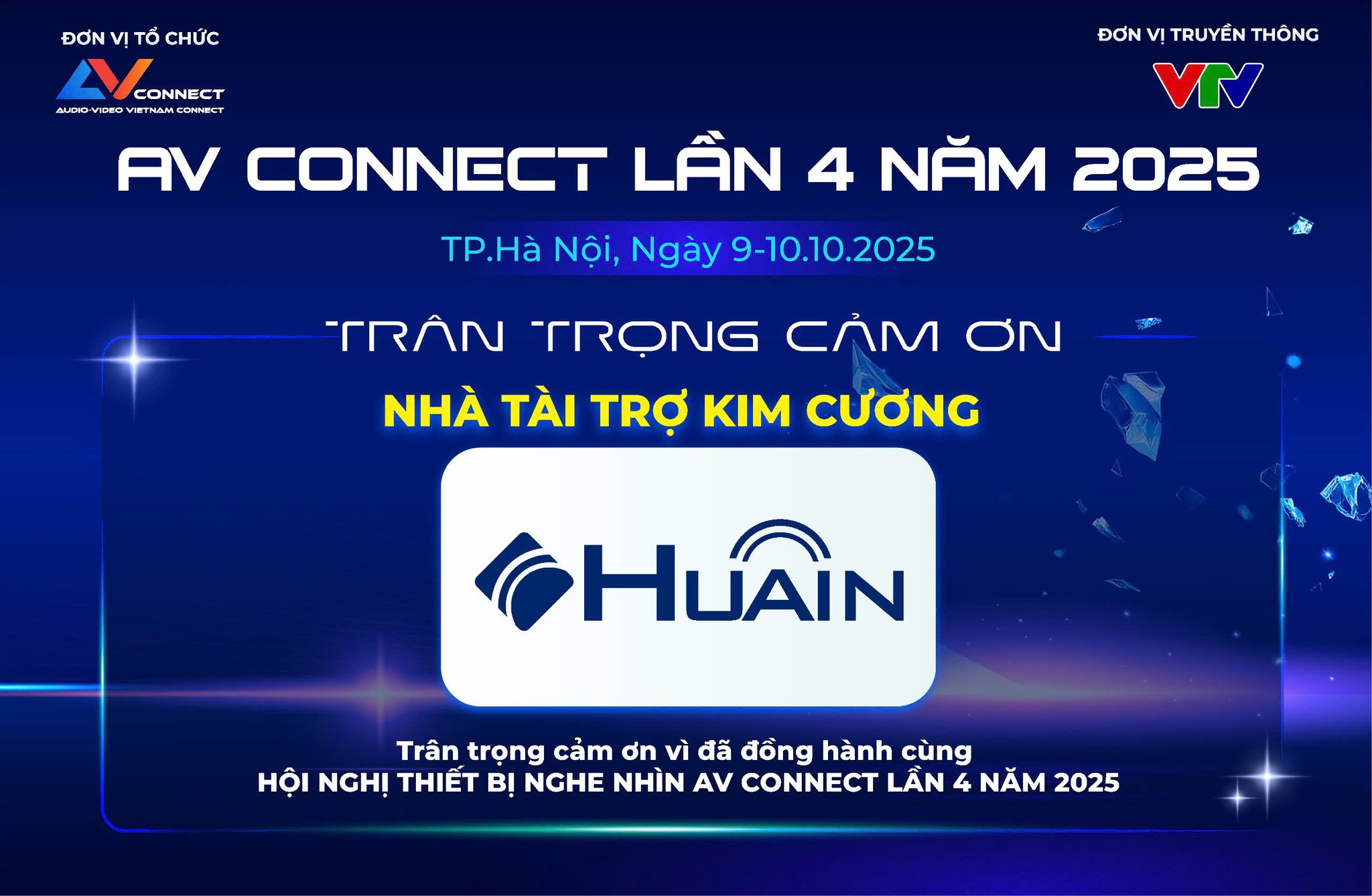 Để sự kiện “Hội nghị thiết bị nghe nhìn AV CONNECT lần 4 năm 2025” được diễn ra quy mô và thành công không thể thiếu sự đồng hành của các đơn vị tài trợ. Ban tổ chức AV CONNECT rất hân hạnh được đồng hành cùng “HUAIN – NHÀ TÀI TRỢ KIM CƯƠNG”.