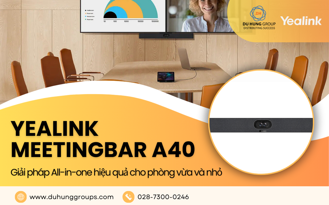 Yealink MeetingBar A40 là một thiết bị hội nghị truyền hình all-in-one tiên tiến, được thiết kế tối ưu cho các phòng họp vừa và nhỏ. Với sự kết hợp hoàn hảo giữa công nghệ hiện đại và thiết kế tiện dụng, MeetingBar A40 mang đến trải nghiệm họp trực tuyến chuyên nghiệp, tiết kiệm chi phí và dễ dàng triển khai. Cùng Du Hưng tìm hiểu chi tiết về Yealink MeetingBar A40 trong bài viết dưới đây.