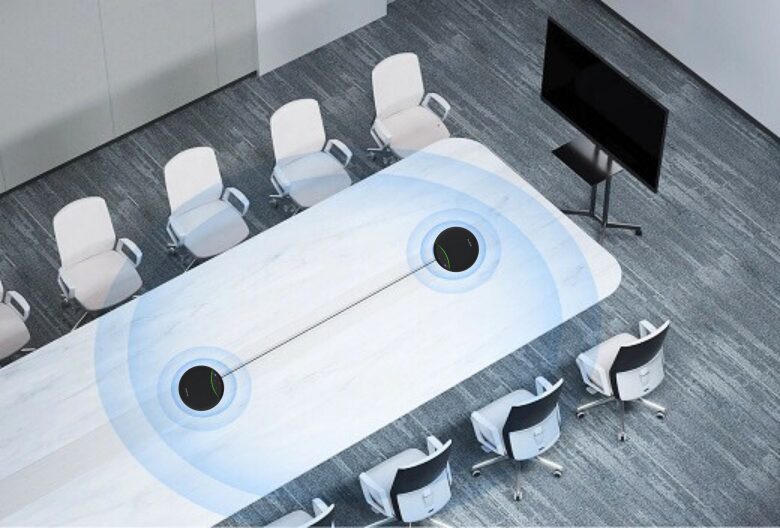 Khi sử dụng bộ Yealink SP96 PLUS (2 loa SP96), doanh nghiệp có thể bố trí loa linh hoạt trên bàn họp dài, đảm bảo mọi vị trí ngồi đều được thu âm rõ ràng và nghe âm thanh chân thực.