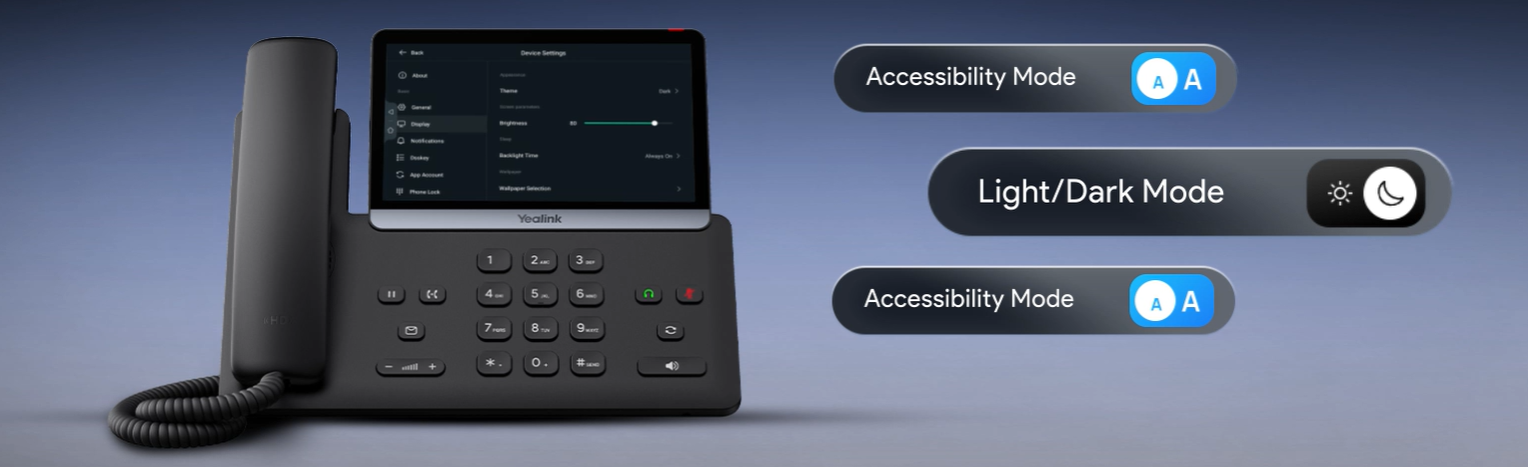 Yealink T77U nổi bật với màn hình cảm ứng màu 7 inch độ phân giải 800 x 480 pixel, hiển thị sắc nét, rõ ràng ngay cả trong môi trường ánh sáng mạnh. Giao diện trực quan với biểu tượng lớn, thao tác chạm mượt mà giúp người dùng dễ dàng chuyển đổi giữa cuộc gọi, danh bạ và các ứng dụng, mang lại trải nghiệm sử dụng gần giống smartphone. Thiết bị còn hỗ trợ Dark Mode & Light Mode, giúp giảm mỏi mắt khi làm việc lâu dài.