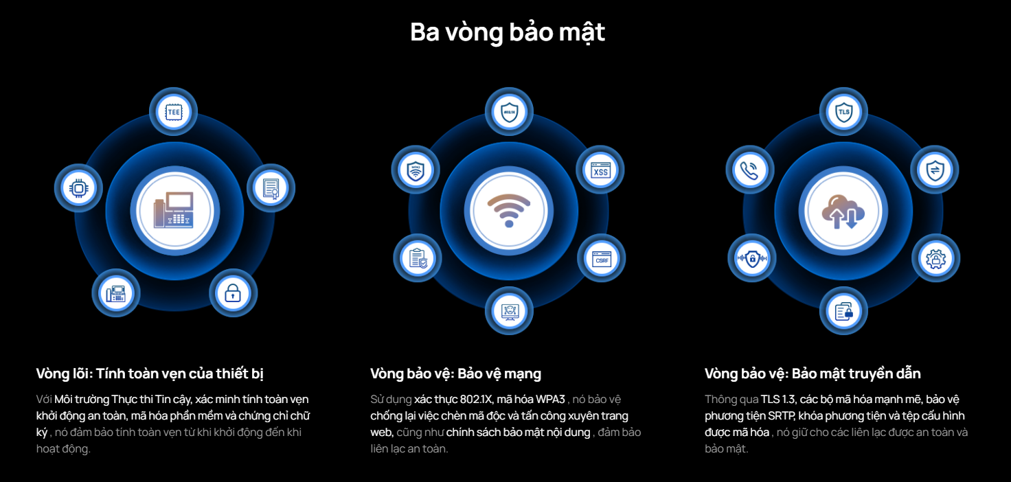 Yealink T77U được trang bị hệ thống bảo mật cấp doanh nghiệp, giúp bảo vệ an toàn dữ liệu và nội dung cuộc gọi trong suốt quá trình sử dụng. Thiết bị hỗ trợ các chuẩn mã hóa hiện đại như TLS và SRTP, kết hợp với giải pháp mã hóa phần cứng TEE, đảm bảo thông tin liên lạc luôn được bảo mật ở mức cao.