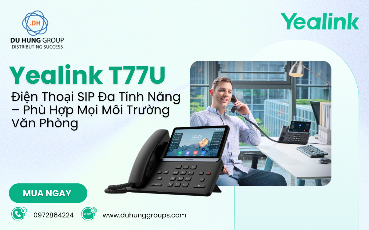 Yealink T77U – mẫu điện thoại SIP cao cấp thuộc dòng T7X của Yealink – chính là lựa chọn lý tưởng cho các văn phòng hiện đại, doanh nghiệp đa phòng ban, lễ tân, quản lý cấp cao và trung tâm chăm sóc khách hàng. Với màn hình cảm ứng 7 inch, hỗ trợ lên đến 16 tài khoản SIP, chất lượng âm thanh HD Optima, khả năng mở rộng linh hoạt cùng hệ sinh thái phụ kiện phong phú, Yealink SIP-T77U không chỉ là một chiếc điện thoại bàn IP thông thường mà còn là trung tâm giao tiếp thông minh cho mọi môi trường văn phòng. Cùng Du Hưng tìm hiểu chi tiết về chiếc điện thoại Yealink T77U trong bài viết dưới đây.