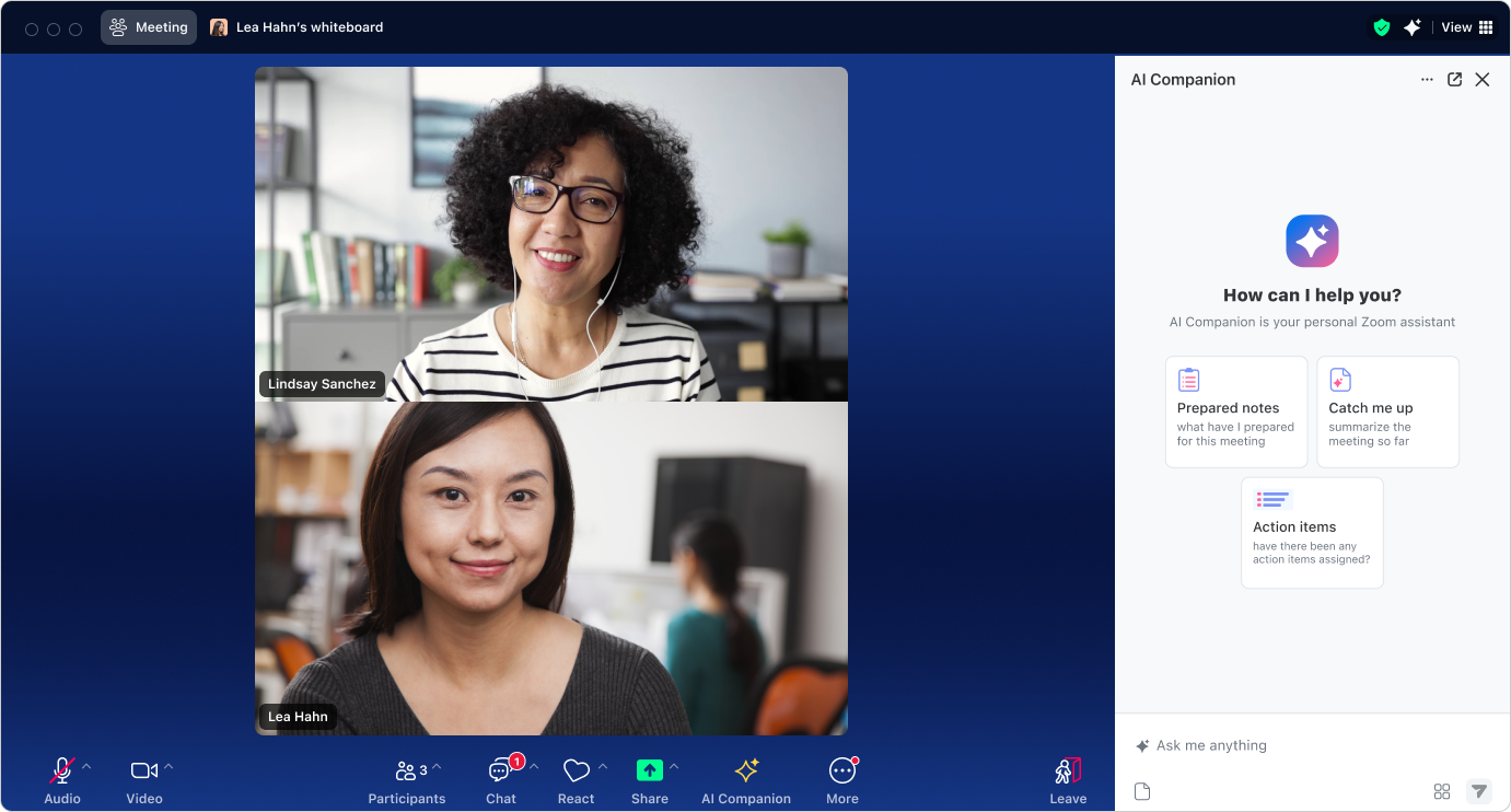 Sắp ra mắt, Ask AI Companion là một tính năng mới sẽ được tích hợp trong AI Companion. Ask AI Companion có thể thu thập, tổng hợp và chia sẻ thông tin quan trọng từ nhiều nguồn trên nền tảng Zoom và từ các ứng dụng chọn lọc của bên thứ ba. Ask AI Companion cũng có thể thay mặt bạn hoàn thành các công việc thường ngày, chẳng hạn như tạo tài liệu chuẩn bị cuộc họp với nội dung có liên quan như tóm tắt cuộc họp và chuỗi trò chuyện, soạn thảo chương trình và lên ý tưởng. Ask AI Companion sẽ được cung cấp trên Zoom Workplace, để trợ lý kỹ thuật số được AI hỗ trợ luôn sẵn sàng phục vụ bạn, giúp nâng cao hiệu suất để lịch trình của bạn bớt bận rộn.