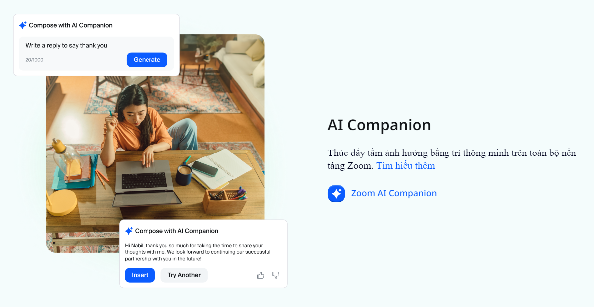 Zoom Workplace cung cấp trải nghiệm hỗ trợ AI thúc đẩy năng suất và sự cộng tác để giúp các nhóm tận dụng tối đa thời gian của mình. Lực lượng lao động hiện đại cần AI được triển khai liền mạch trên toàn bộ quy trình làm việc của họ theo cách tiết kiệm chi phí. Zoom AI Companion, có sẵn mà không mất thêm chi phí, giúp kết nối với đồng nghiệp và khách hàng dễ dàng hơn và giúp hoàn thành công việc hiệu quả hơn, do đó, người dùng có thể tự do giải quyết các dự án có ý nghĩa thúc đẩy tác động kinh doanh”.